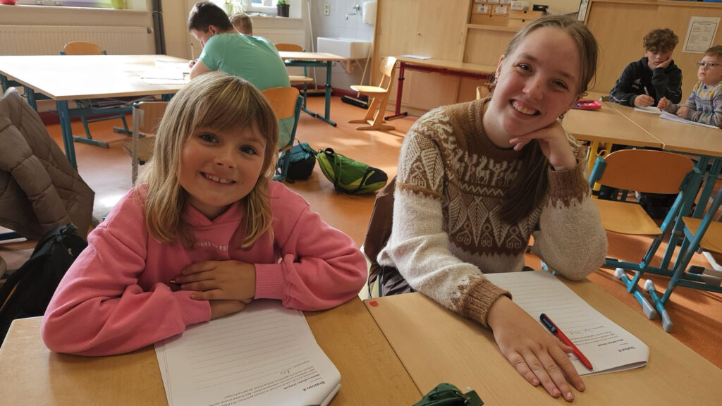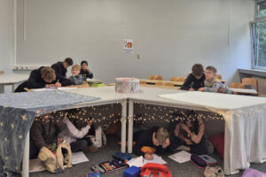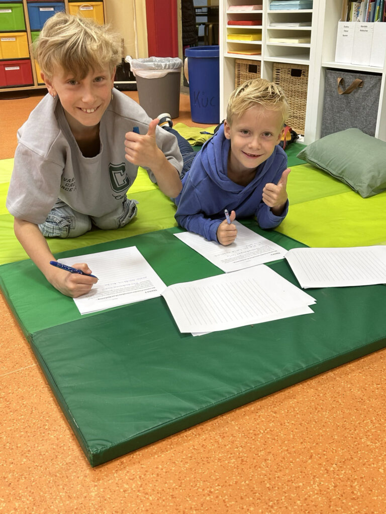Beim Buchprojekt durften die Kinder selbst entscheiden, wo sie schreiben wollten. Sie suchten sich gemütliche Plätze in den Klassenräumen und in den Nebenräumen – einige machten es sich auf Matten bequem, andere lagen in kleinen gebauten Höhlen oder sie arbeiteten an Tischen und Fensterbänken. So entstand eine kreative und entspannte Schreibatmosphäre, in der jedes Kind seinen eigenen Lieblingsplatz fand.