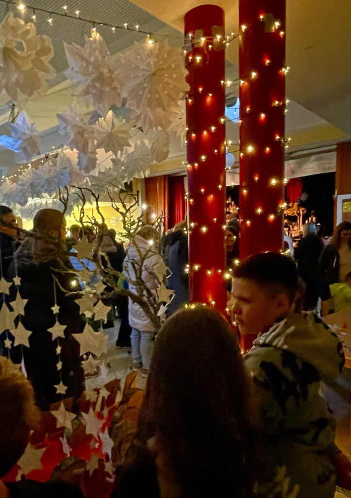 Die Aula erstrahlte in besonderem Glanz: Überall hingen unzählige Papiersterne, die die Kinder im Unterricht gebastelt hatten und die der Förderverein liebevoll aufgehängt hatte