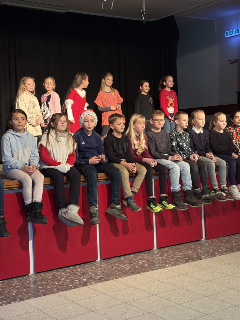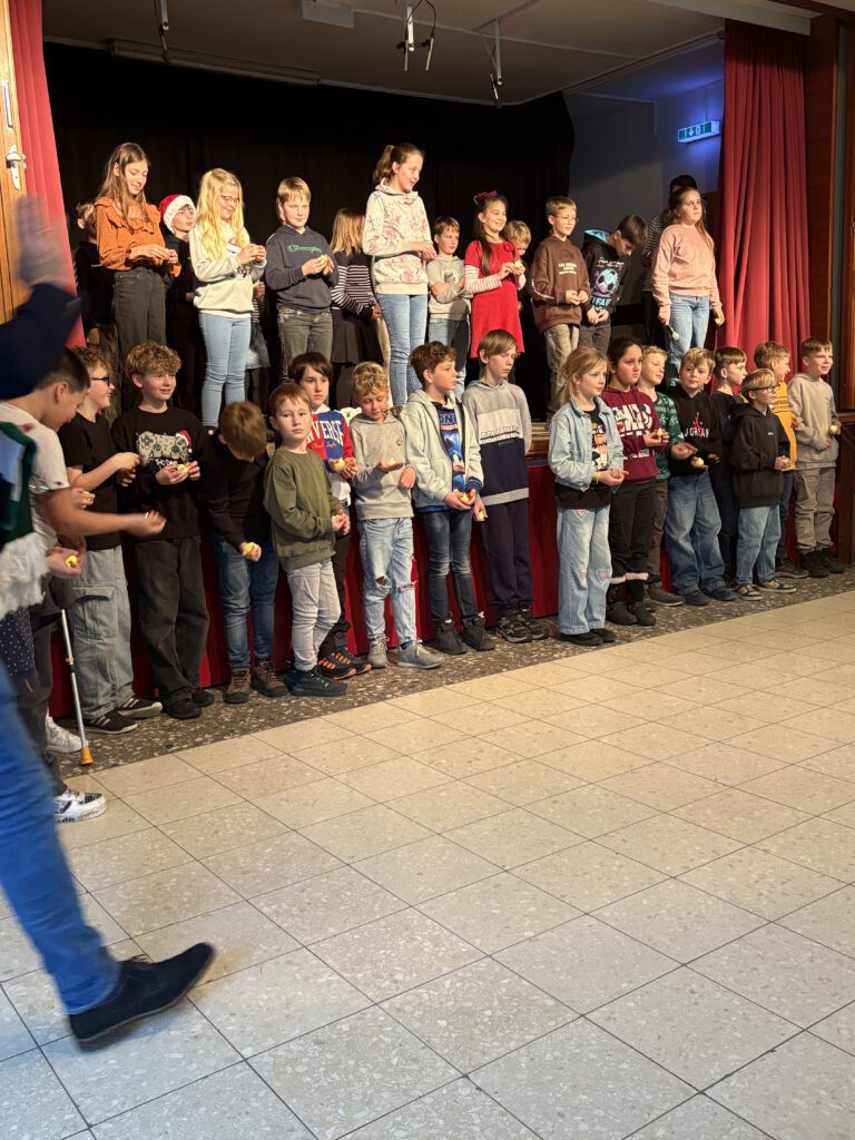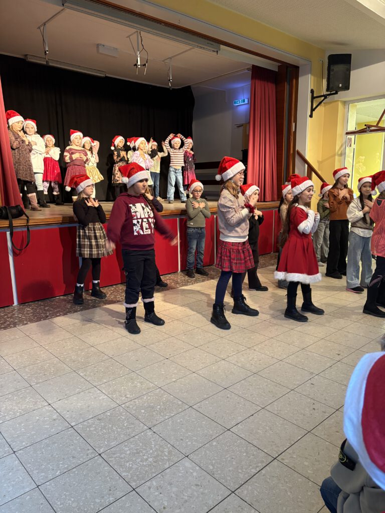 Anschließend versammelten sich alle Klassen in der Aula, wo den Kindern, den Eltern und anderen Verwandten ein abwechslungsreiches und liebevoll gestaltetes Programm präsentiert wurde. Jede Klasse trug mit einer eigenen Aufführung zum Gelingen der Feier bei. Zu sehen waren unter anderem ein sportlicher Beitrag mit „Fitness für den Weihnachtsmann“, das schwungvolle Lied „Feliz Navidad“, eine kreative Darstellung rund um die Weihnachtsmaus sowie eine wundervolle Aufführung unter dem Motto „Sternenhimmel“.